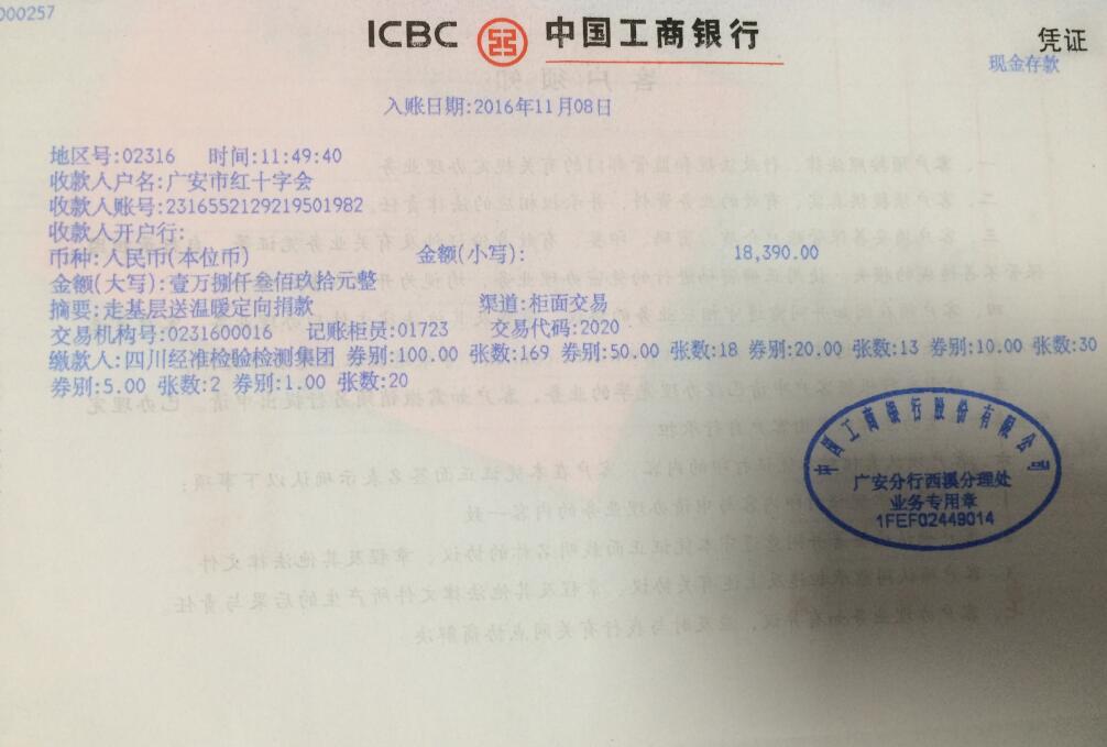 11月4日下午,經準檢測集團組織廣大干部職工開展了以“扶貧濟困、你我同行”為主題的“走基層、送溫暖”定向捐贈活動,各子公司按照“自覺自愿、不限數額、現金為主”的原則自行組織干部職工進行了捐贈,共計捐贈人民幣18390元,目前已將所有捐款匯入廣安市紅十字會賬戶。