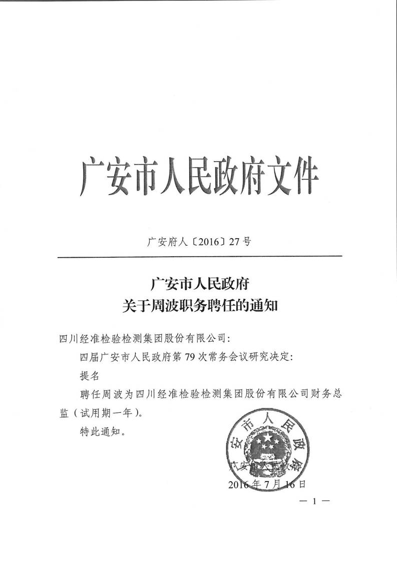 廣安市人民政府關于周波職務聘任的通知