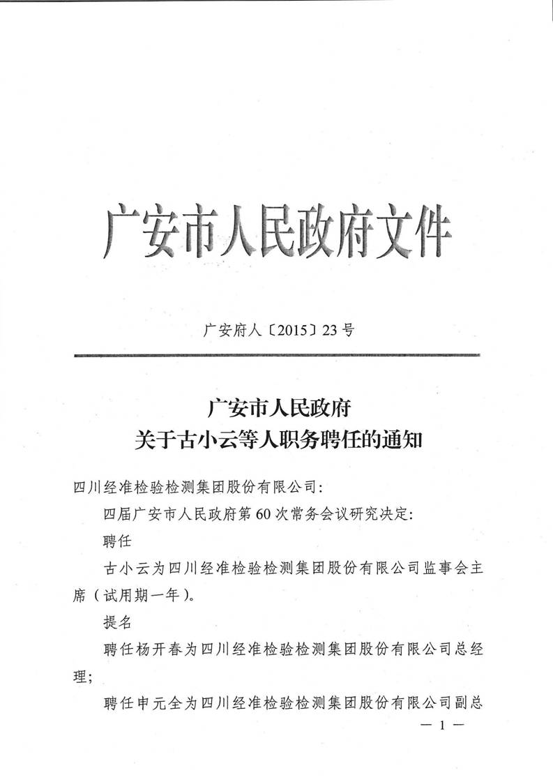 廣安市人民政府關(guān)于古小云等人職務(wù)聘任的通知