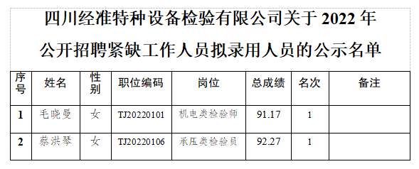 四川經(jīng)準(zhǔn)特種設(shè)備檢驗(yàn)有限公司關(guān)于2022年公開(kāi)招聘緊缺工作人員 擬錄用人員的公示