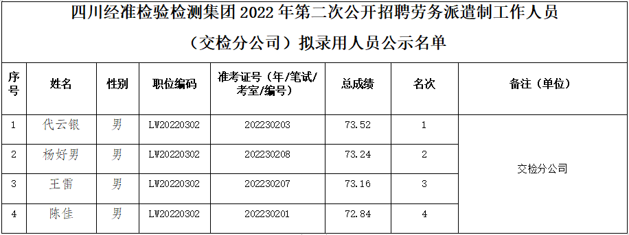 附表:四川經準檢驗檢測集團2022年第二次公開招聘勞務派遣制工作人員(交檢分公司)擬錄用人員公示名單