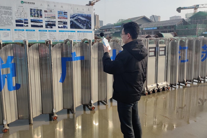 圖為采樣人員在工地外圍進(jìn)行噪聲監(jiān)測(cè)實(shí)操