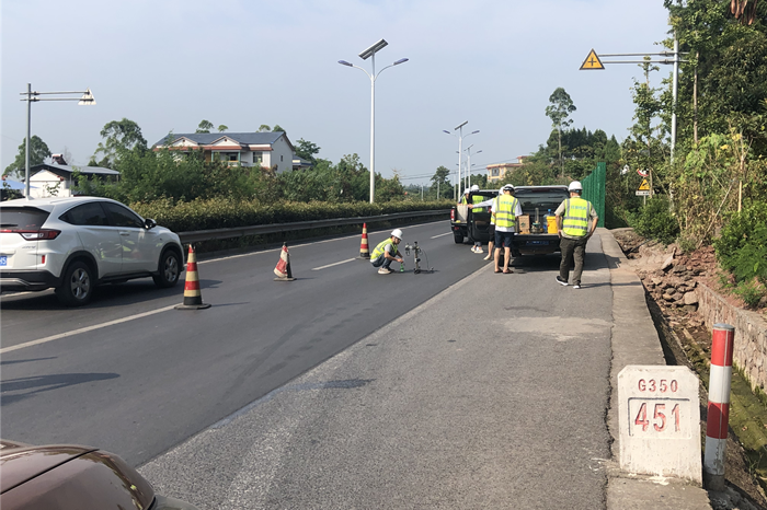 在國道G350線預(yù)防性能養(yǎng)護(hù)工程交工檢測項(xiàng)目,檢測隊(duì)伍面臨項(xiàng)目較多、工作量大、作業(yè)面寬、路段較長、氣溫較高等問題,交檢分公司做好了安全技術(shù)交底工作,同時充分做好了現(xiàn)場防暑工作,派出了安全員現(xiàn)場監(jiān)督,保障檢測項(xiàng)目井然有序開展。
