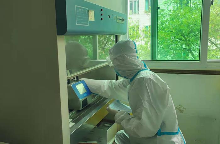 圖為檢測人員在岳池縣人民醫院檢生物安全柜