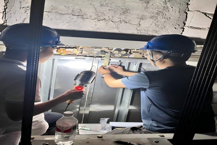 (圖為公司檢驗師現場指導項目組工作人員開展電梯檢測實操)