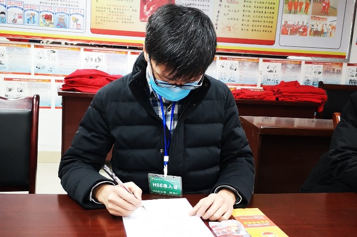圖為特檢公司檢驗人員簽訂進入生產作業場所HSE安全告知卡