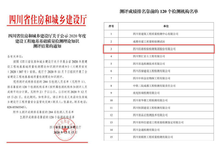 經準檢測集團喜獲2020年建設工程地基基礎質量檢測理論知識測評全省第三名