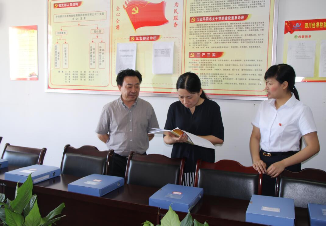 圖為王冬霞部長(zhǎng)(左二)查閱公司黨建資料