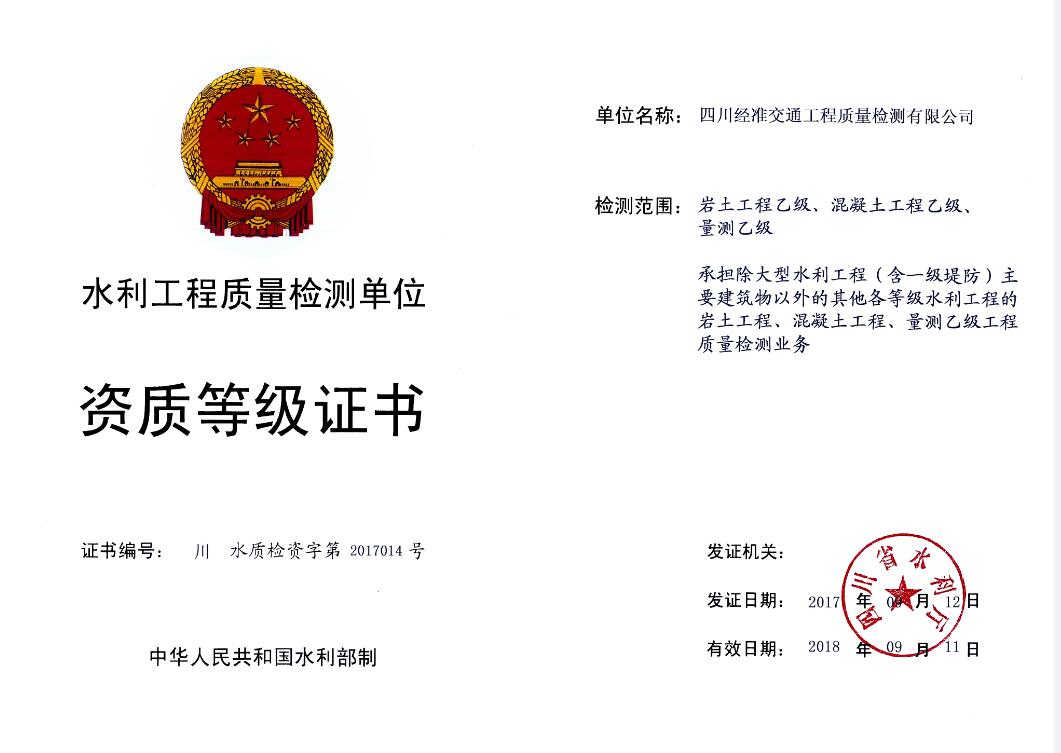 9月12日,交檢公司正式取得省水利廳頒發的水利檢測混凝土、巖土、量測三個類別的乙級資質證書。