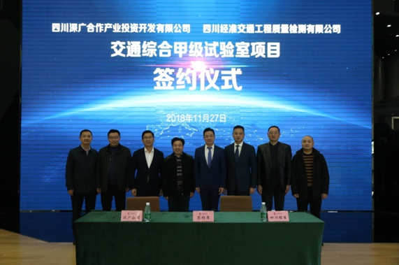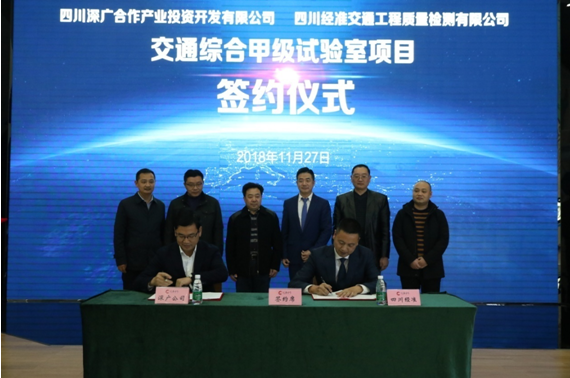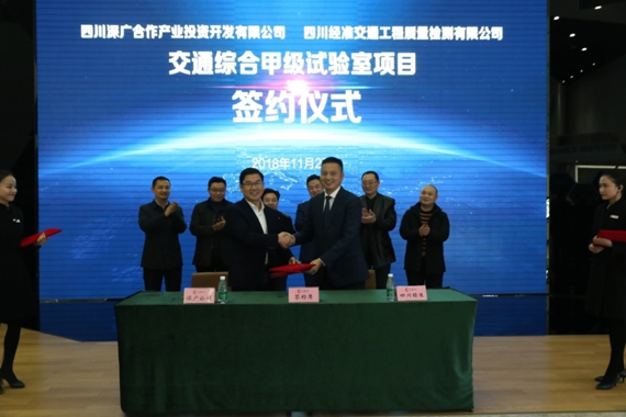 11月27日,四川深廣合作產(chǎn)業(yè)投資開發(fā)有限公司與四川經(jīng)準(zhǔn)交通工程質(zhì)量檢測有限公司(四川經(jīng)準(zhǔn)檢驗檢測集團(tuán)下屬全資子公司)在深廣展覽館舉行了交通綜合甲級試驗室項目簽約儀式。簽約儀式上,四川深廣合作產(chǎn)業(yè)投資開發(fā)有限公司常務(wù)副總經(jīng)理張久龍與經(jīng)準(zhǔn)檢測集團(tuán)總經(jīng)理楊開春簽署了《交通綜合甲級試驗室項目合作協(xié)議》,標(biāo)志著雙方合作正式啟動。四川深廣合作產(chǎn)業(yè)投資開發(fā)有限公司總經(jīng)理王清峰、監(jiān)事會主席梁思明、副總經(jīng)理何治與經(jīng)準(zhǔn)檢測集團(tuán)董事長劉登宏、副總經(jīng)理吳明、交檢公司副總經(jīng)理文啟宇見證簽約。