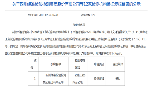 評審組通過現場考核、查閱資料、座談提問等多種方式充分肯定了公司的管理能力、技術能力、服務水平,同時也指出了公司存在的問題與不足,公司根據評審組意見積極配合、全力整改完善,并在規定時間內提交了整改報告。724日,四川省交通運輸廳工程質量監督局對評審結果進行了公示,四川經準檢驗檢測集團的公示評定結果顯示為通過。