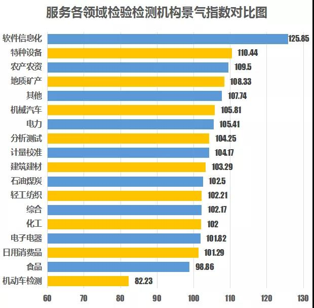 從景氣線上方來看,軟件信息化領域檢驗檢測機構依然最為景氣,而隨著各地特種設備安全排查工作的緊張進行以及部分省市可能對非強制性法定檢驗檢測收費項目和收費標準松綁政策的逐步落地,使得特種設備檢驗檢測領域持續保持較高景氣度。