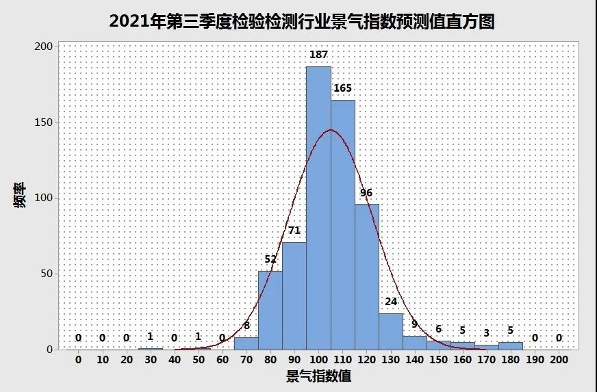 2021年第三季度檢驗檢測行業預期景氣指數達到,處于歷史第三高水平。從直方圖分布來看,頻數峰值來到100-110之間,表明整體機構的樂觀情緒決定預測值的提升。大多數機構處于上升通道內。目前看來,2021年的前兩個季度,檢驗檢測行業發展穩健,積蓄力量。是否能在第三季度保持高度景氣?是否能夠在行業高質量發展上面有所突破?或者是否能通過一些大型機構的并購或組建打破區域甚至整個檢驗檢測市場的整體運行態勢,值得行業從業人員關注。