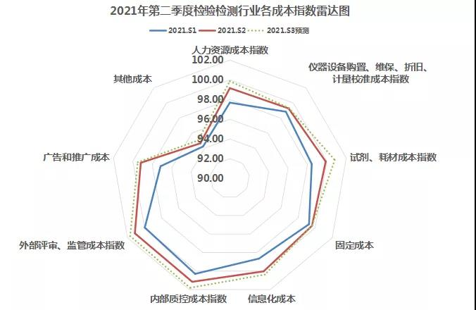 2021年第二季度處于年中,作為機構成本占比較大的三項:固定成本、儀器設備成本以及人力資源成本均相對壓力較小。因此帶動整體成本指數略有上升,2021年第二季度,檢驗檢測行業成本指數值為,。