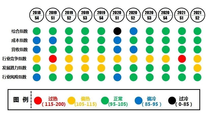 2021年第一季度,除隨著經濟從疫情中復蘇,行業競爭指數進入過熱區間之外,紅綠燈圖展示各項指標均沒有明顯質變。