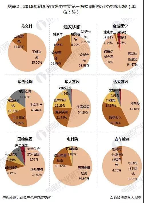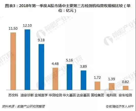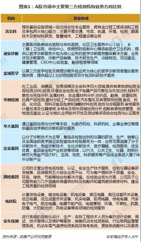 當(dāng)前第三方檢測(cè)行業(yè)中,蘇交科、迪安診斷、金域醫(yī)學(xué)、華測(cè)檢測(cè)、華大基因、達(dá)安基因、國(guó)檢集團(tuán)、電科院、安車檢測(cè)等企業(yè)發(fā)展勢(shì)頭較好;在這些A股市場(chǎng)的企業(yè)中,迪安診斷、金域醫(yī)學(xué)、華大基因與達(dá)安基因在醫(yī)療領(lǐng)域的三番過檢測(cè)較為領(lǐng)先,而蘇交科、華測(cè)檢測(cè)等則是在不同領(lǐng)域中進(jìn)行錯(cuò)位競(jìng)爭(zhēng)。