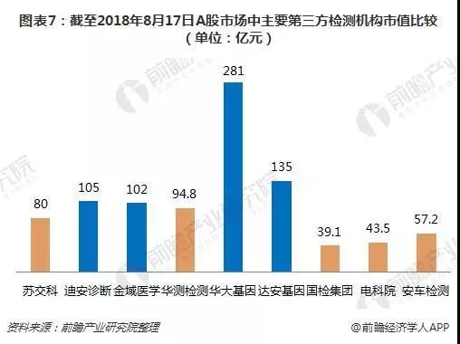 截至2018年8月17日,這7家上市公司的市值如下圖所示。雖然迪安診斷凈資產(chǎn)收益率最高,但市場(chǎng)更看好華大基因,其市值高達(dá)281億元;達(dá)安基因、迪安診斷、金域醫(yī)學(xué)依次位于其后。值得注意的是,醫(yī)療領(lǐng)域第三方檢測(cè)的市值相對(duì)其他領(lǐng)域的第三方檢測(cè)機(jī)構(gòu)市值更高,規(guī)模相對(duì)更大。